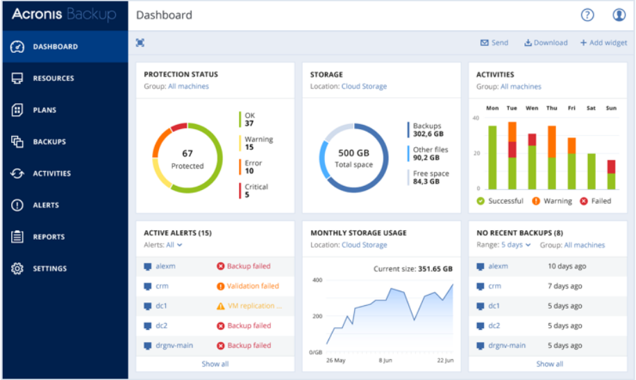 Acronis Cyber Backup niezawodnie chroni dowolne dane na 20+ platformach - wirtualnych, fizycznych, mobilnych i w chmurze, niezależnie od rozmiaru i lokalizacji danych. Gdy twoje potrzeby się zwiększą lub rozrośnie się twoja infrastruktura, zapewnienie bezpieczeństwa danych będzie proste, dzięki elastycznemu i skalowalnemu magazynowi danych oraz prostemu zarządzaniu kopiami zapasowymi.