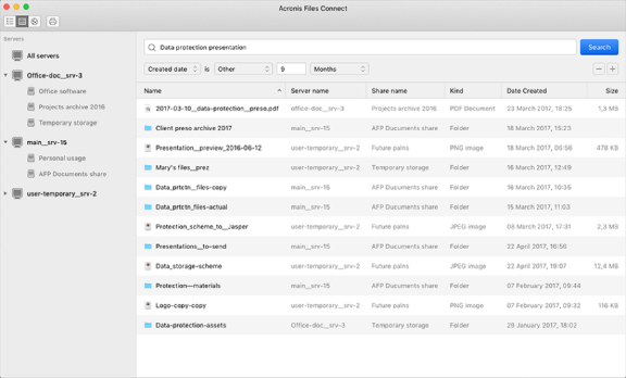 Zazwyczaj, gdy użytkownicy komputerów Mac łączą się z udziałami sieciowymi lub serwerami NAS przy pomocy protokołu SMB, są ograniczeni do wyszukiwania wyłącznie na podstawie nazw plików, które wymaga przeszukiwania plik po pliku całej zawartości udziału. Dzięki rozwiązaniu Acronis Files Connect, komputery Mac mogą łączyć się z udziałami przy użyciu protokołów AFP lub SMB, co pozwala na wyszukiwanie nazw plików i zawartości przez Spotlight za pomocą naszego nowego klienta dla komputerów Mac lub aplikacji Finder.